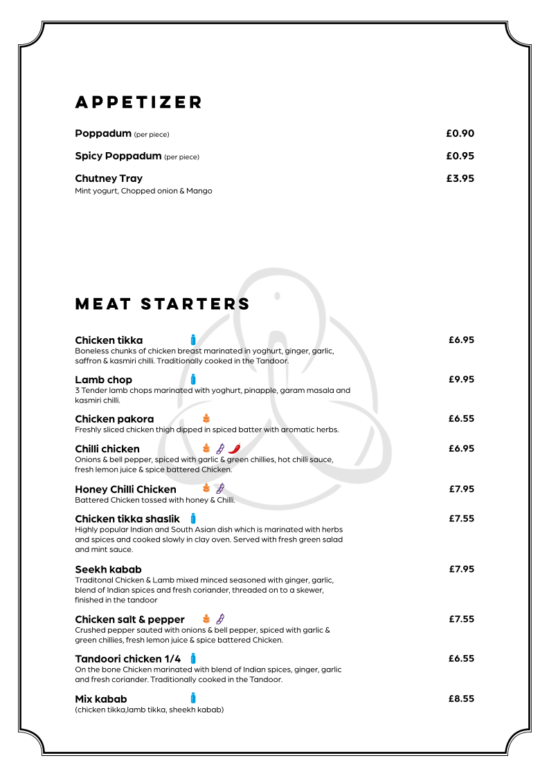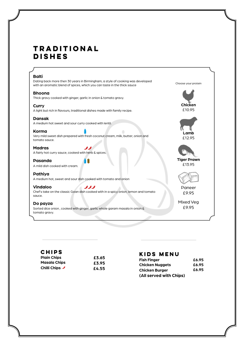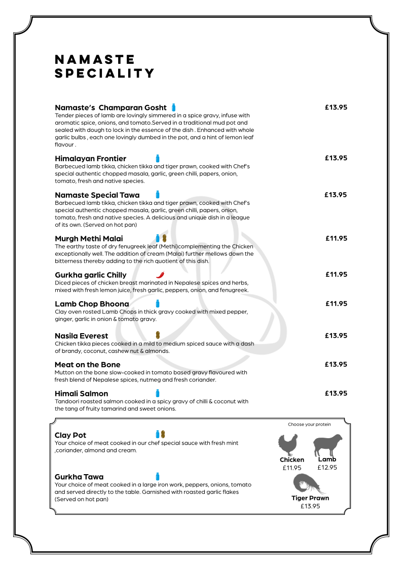 Barbecued lamb tikka, chicken tikka and tiger prawn, cooked with chef’s special authentic chopped masala, garlic, green chilli, papers, onion, tomato, fresh and native species. A delicious and unique dish in a league of its own