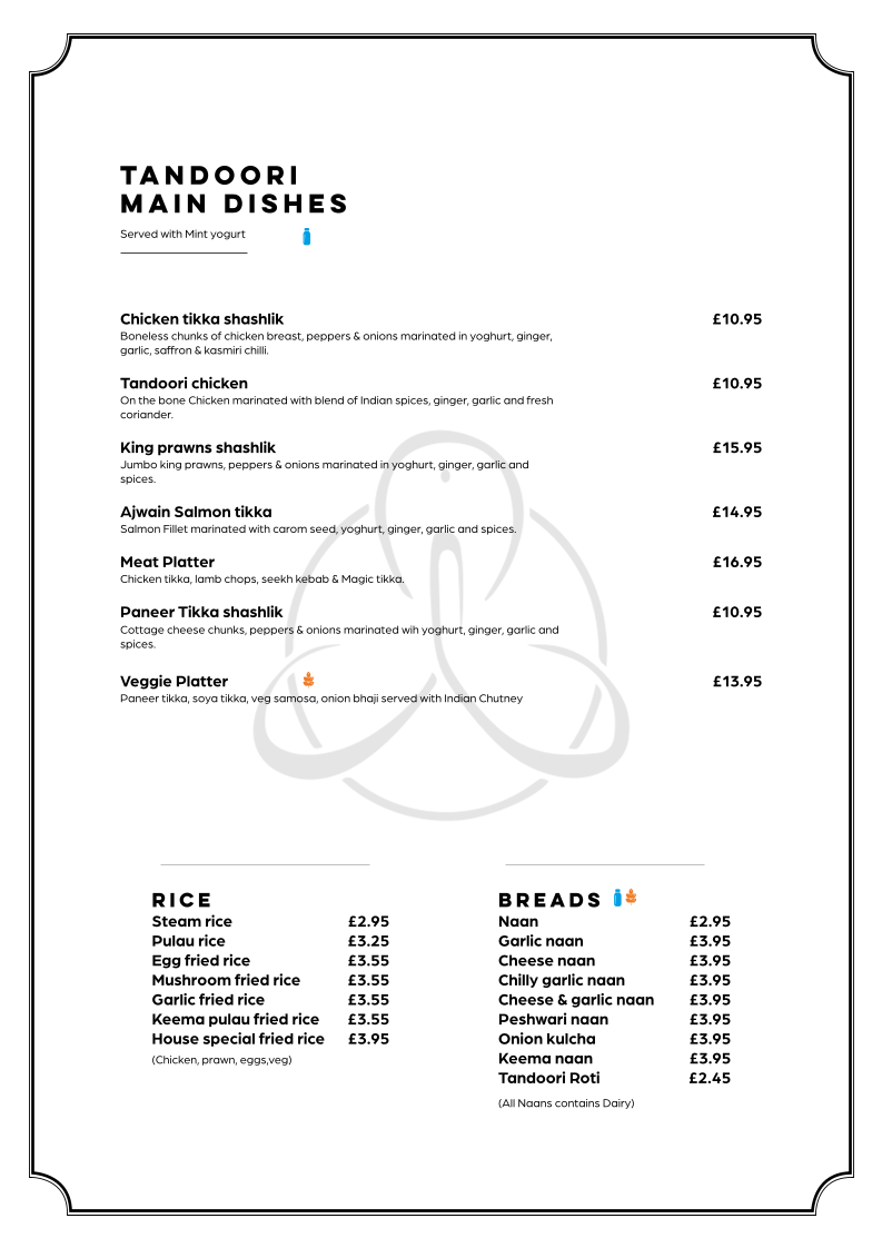 On the bone chicken marinated with blend of Indian spices, ginger, garlic and fresh coriander. Traditionally cooked in the tandoor